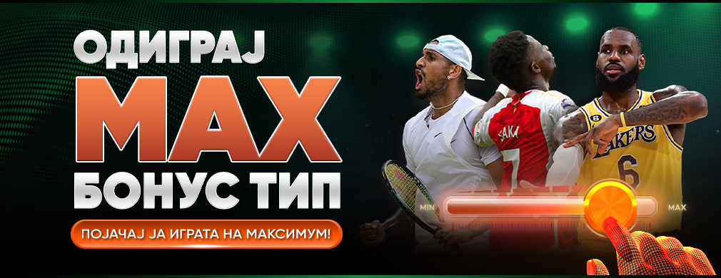*Max Бонус Тип представува издвоена дневна понуда на настани за спортско обложување со поголеми коефициенти на некои исходи во однос на стандардната понуда.